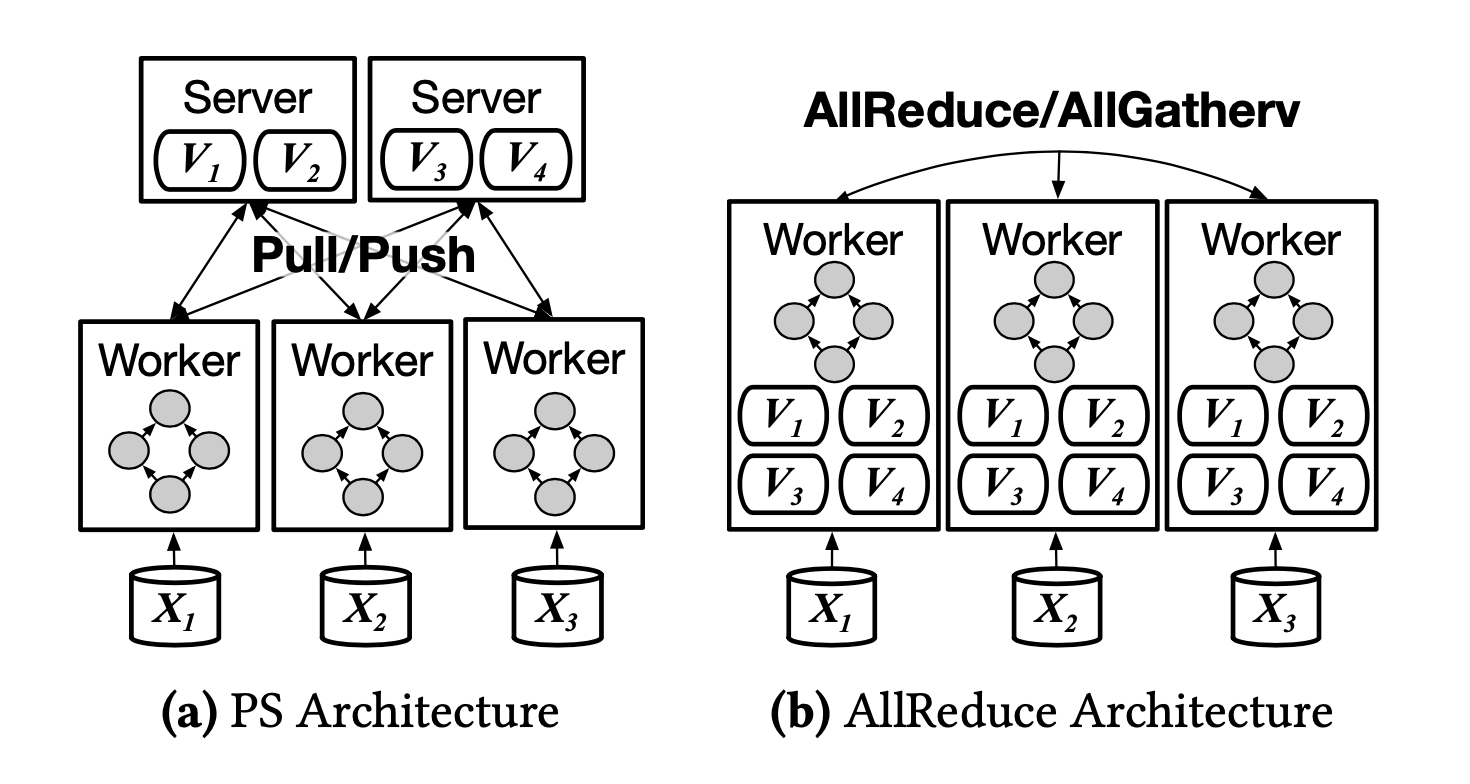 - To optimize the amount of data transfer with considering sparsity, Parallax adopts a hybrid approach that uses Parameter Server architecture for handling sparse variables and AllReduce architecture for dense variables.